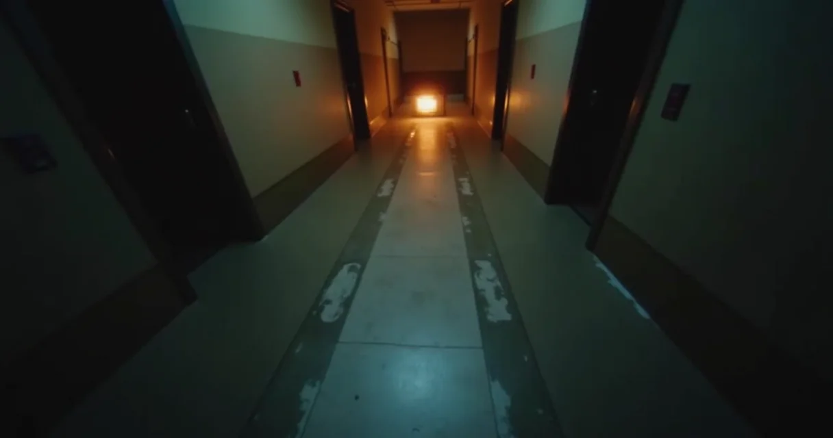 Personagem em jogo de terror, com iluminação fraca e sombras projetadas, transmitindo suspense e vulnerabilidade.